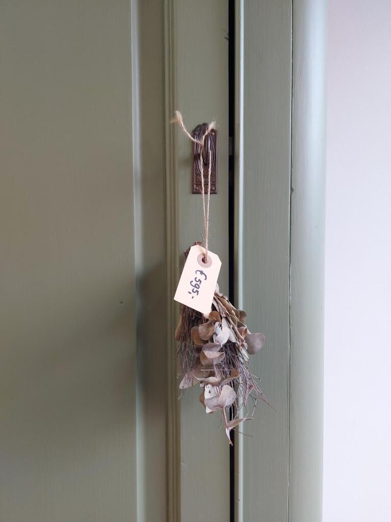 Hij is beschilderd met een matte houtlak in (licht-)olijfgroen.