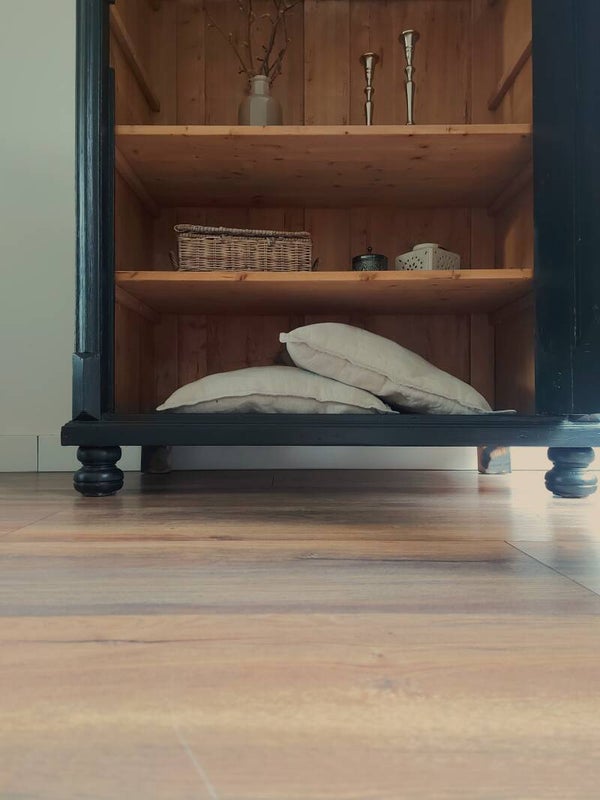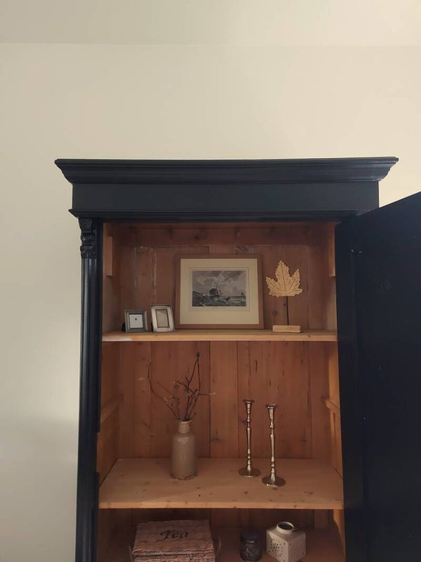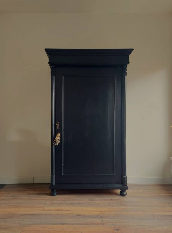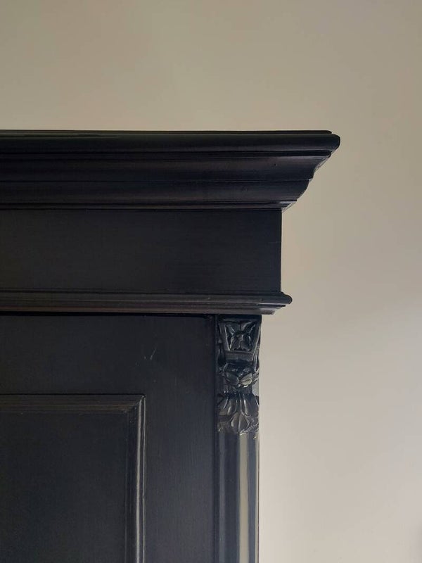 Dit is een bijzondere antieke kast geschilderd met mat-zwarte houtlak.