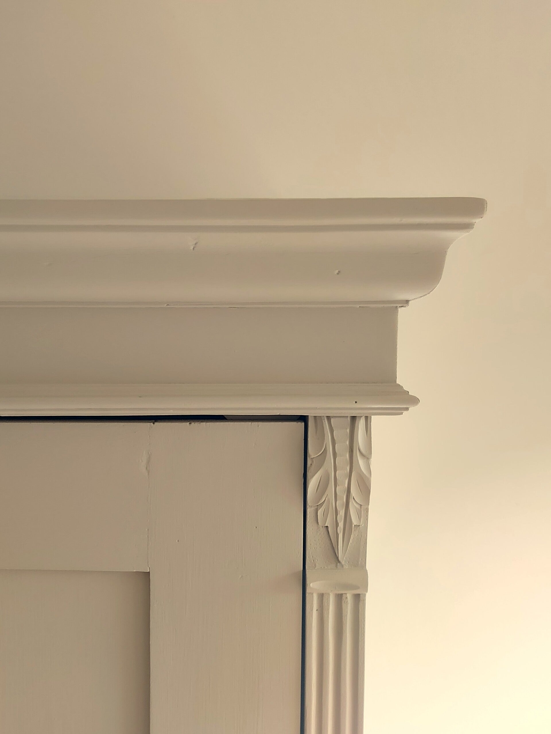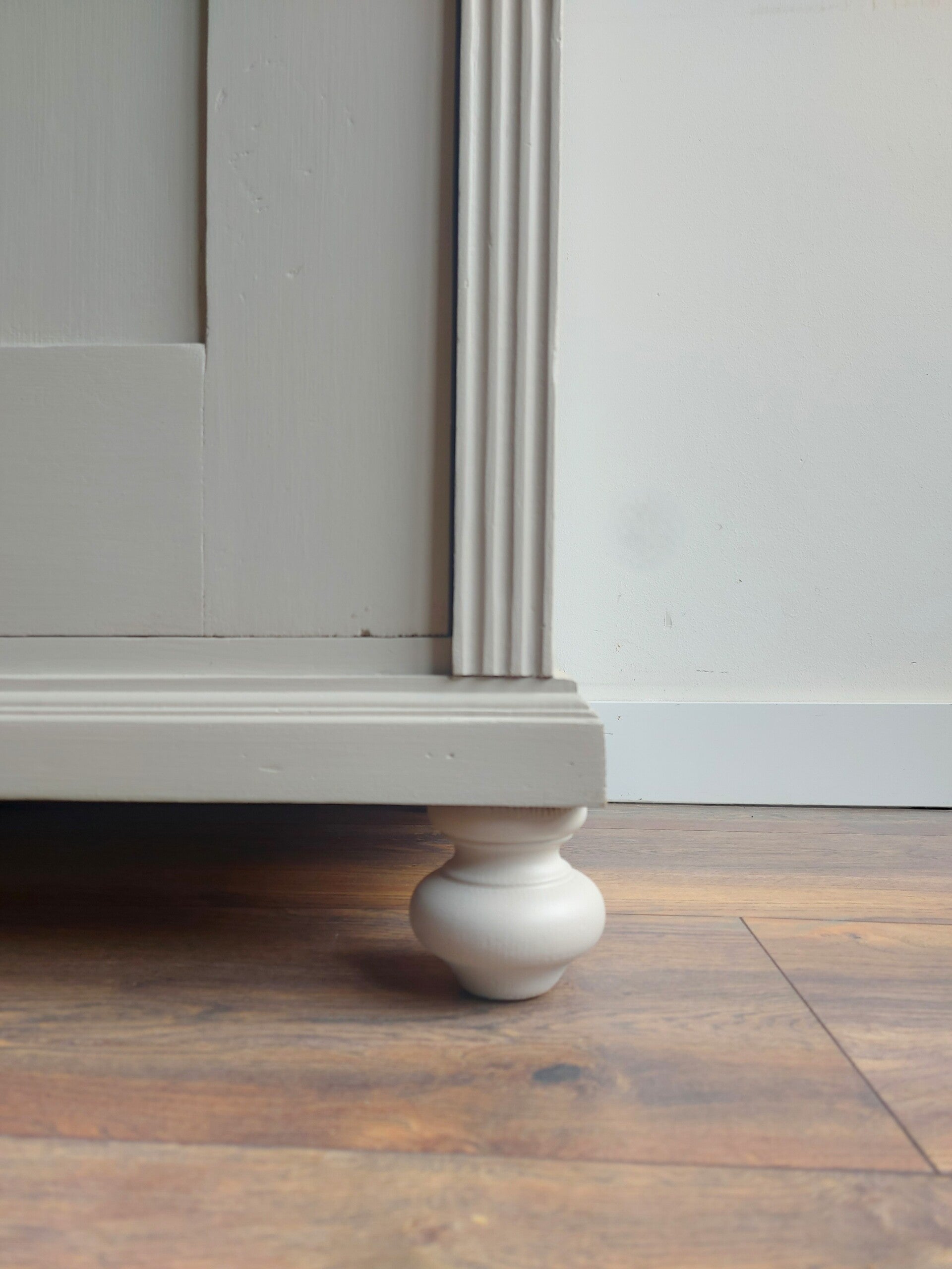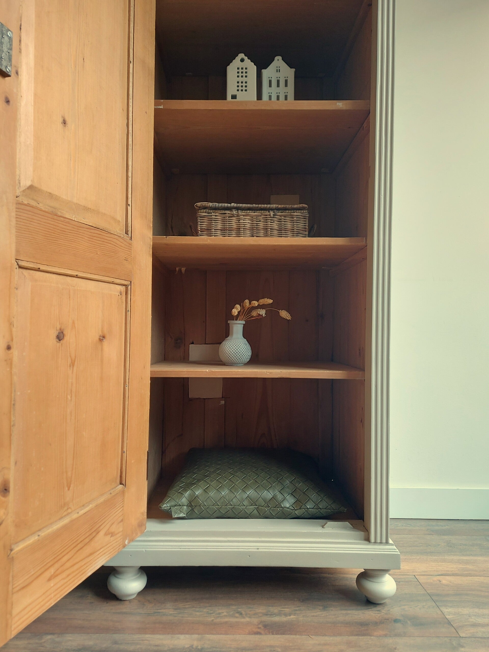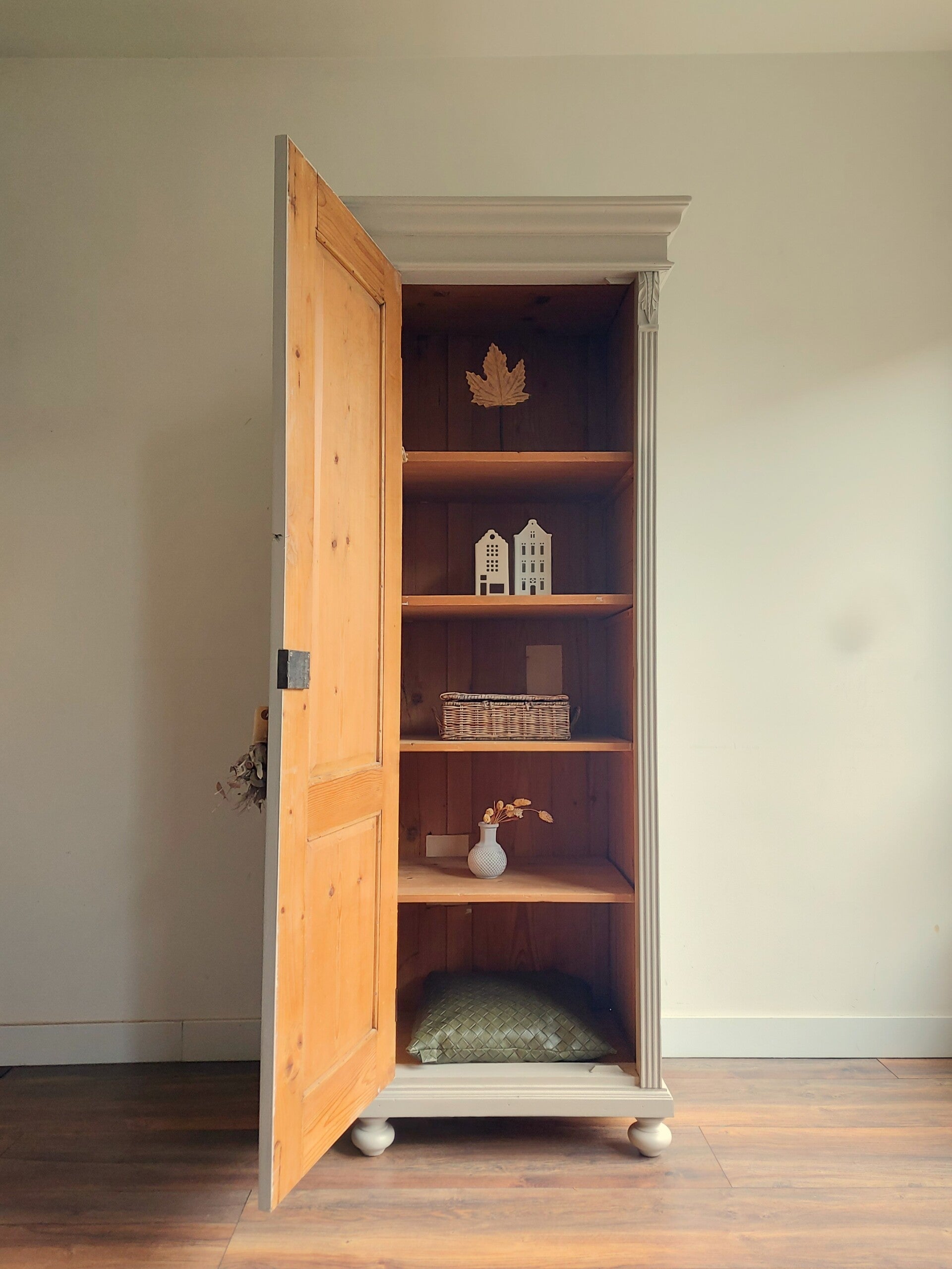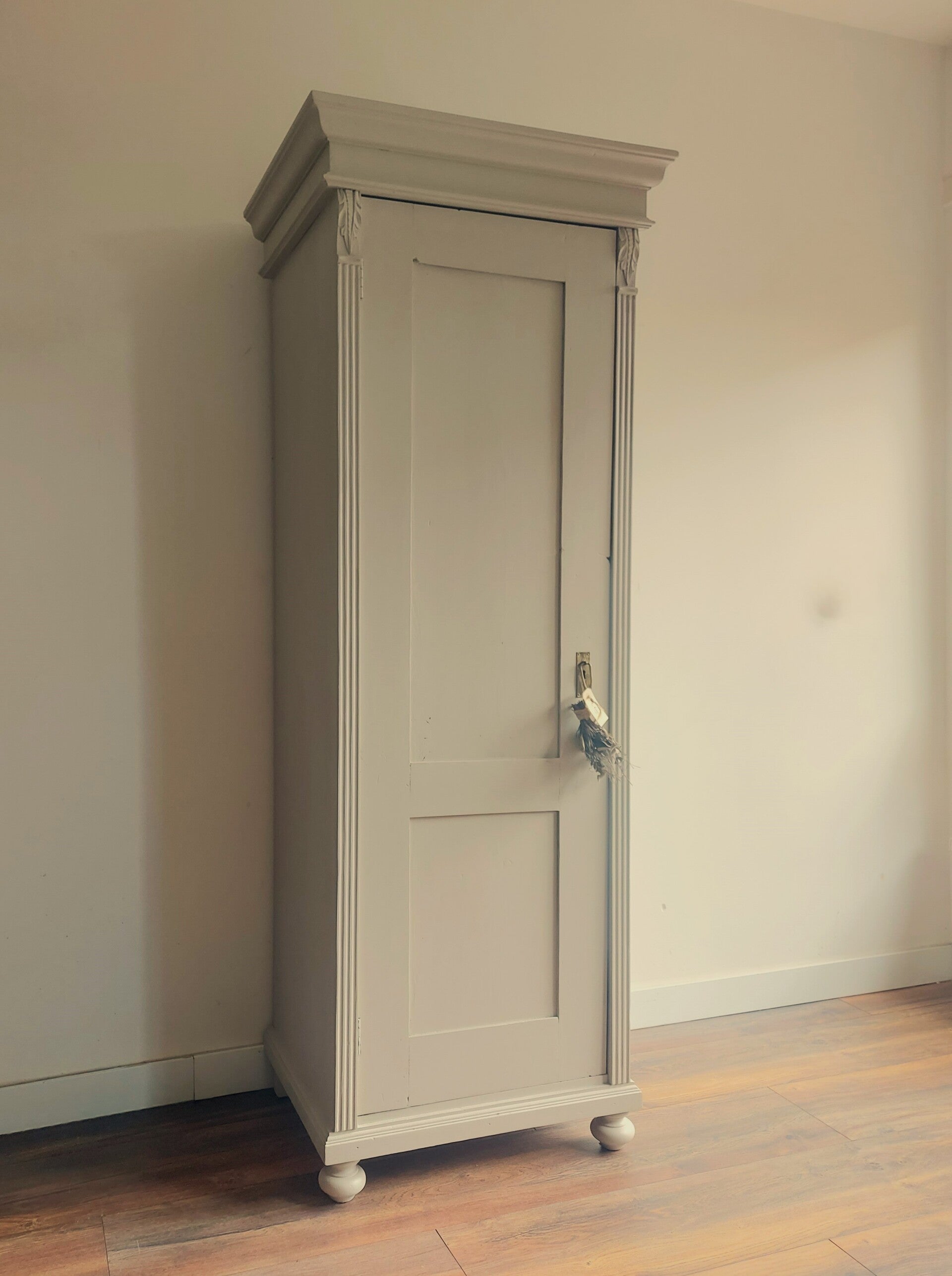 Een prachtige smalle oud-grenen kast, geschilderd met matte houtlak in warm-wit.