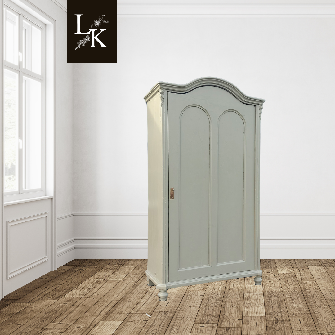 Dit is een bijzondere antieke kast van orgine waarschijnlijk uit de Balkan regio. De kast is geschilderd in een matte houtlak in de kleur eucalyptus groen. Overigens is het ook een zeer gewild model!(: