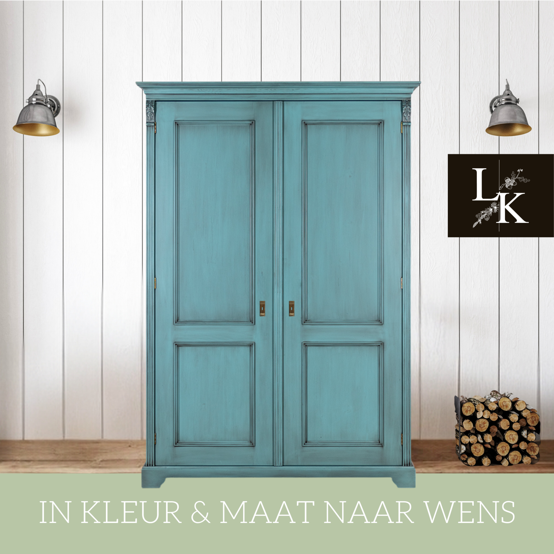 Deze mooie tweedeurskast kan afgewerkt worden met een mooie wax of geschilderd in een RAL-kleur naar keuze.
