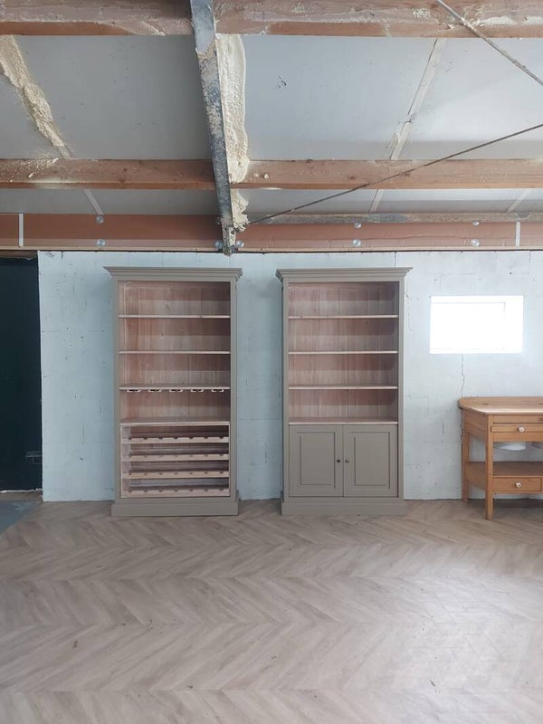 Dit zijn twee een bijzondere boekenkasten. Een uitgevoerd met deurtjes en de andere kast met een wijngedeelte.