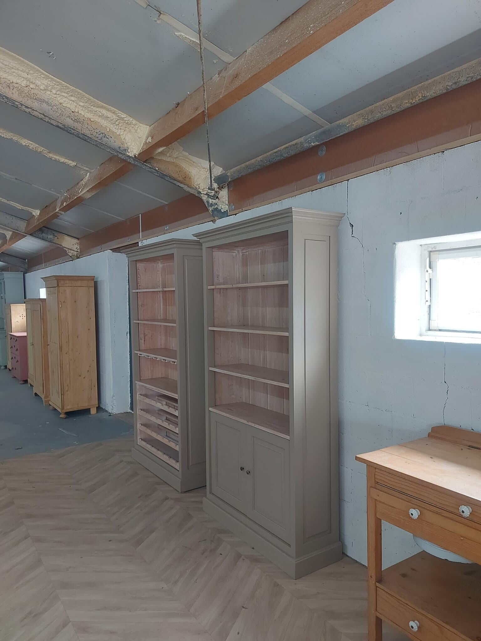 De kasten zijn gemaakt van massief eikenhout en geschilderd in grijs-bruin/taupe met matte houtlak.