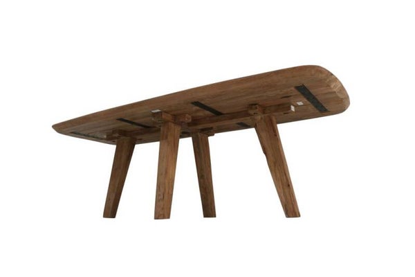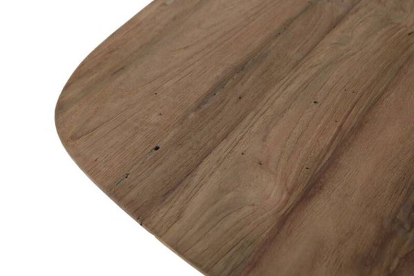 Het teakhout is afgewerkt met een natuurlijke coating die de authentieke kleur en textuur van het hout behoudt. Dit geeft de tafel een organische uitstraling en benadrukt de unieke kenmerken van het teakhout.